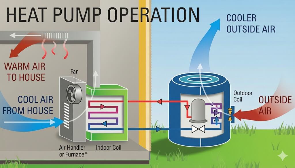When temperatures drop, the heat pump reverses direction. The reversing valve changes the refrigerant flow, and the system starts extracting heat from the outdoor air: